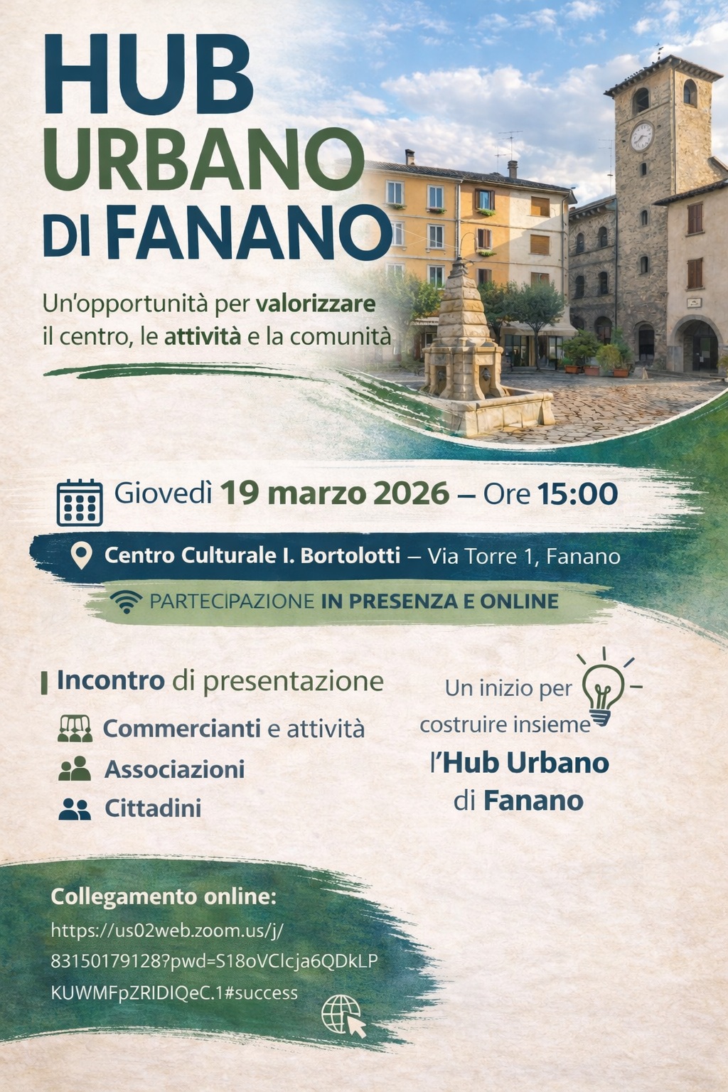 Il Comune di Fanano, nell’ambito delle politiche regionali per lo sviluppo dell’economia urbana previste dalla Legge Regionale Emilia-Romagna n. 12/2023 e dalla DGR n. 1013/2024, intende avviare il percorso di costituzione dell’Hub urbano di Fanano, quale strumento di sviluppo territoriale finalizzato a rafforzare la rete commerciale, i servizi e l’attrattività del centro urbano, promuovendo iniziative condivise tra amministrazione pubblica, imprese e comunità locale con l’obiettivo è costruire una strategia di sviluppo coordinata che integri commercio, servizi, iniziative culturali e valorizzazione degli spazi pubblici, contribuendo al rilancio economico e sociale del territorio.