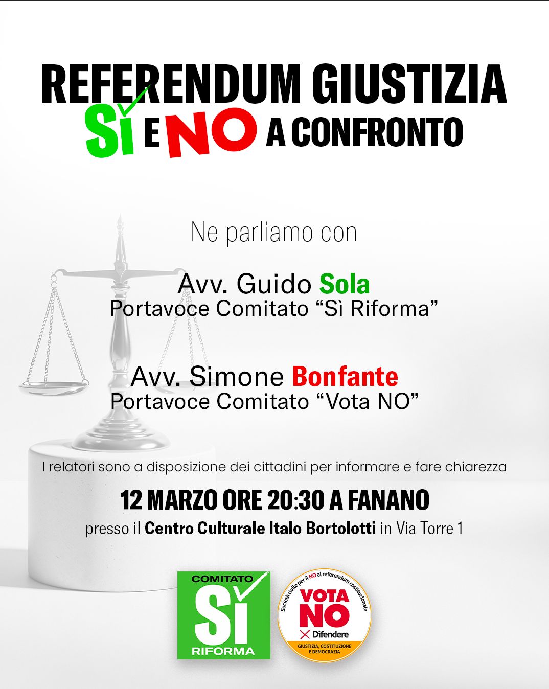 Il 12 marzo alle ore 20;30, presso il Centro Culturale I. Bortolotti di Fanano (Via Torre 1), si terrà un incontro di approfondimento relativamente al REFERENDUM GIUSTIZIA.